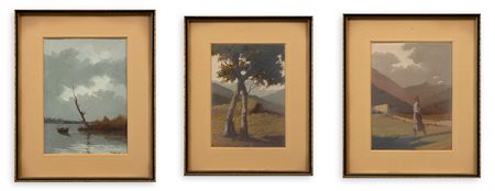 Lotto unico di 3 tempere su cartoncino raffiguranti scorci di paesaggio
