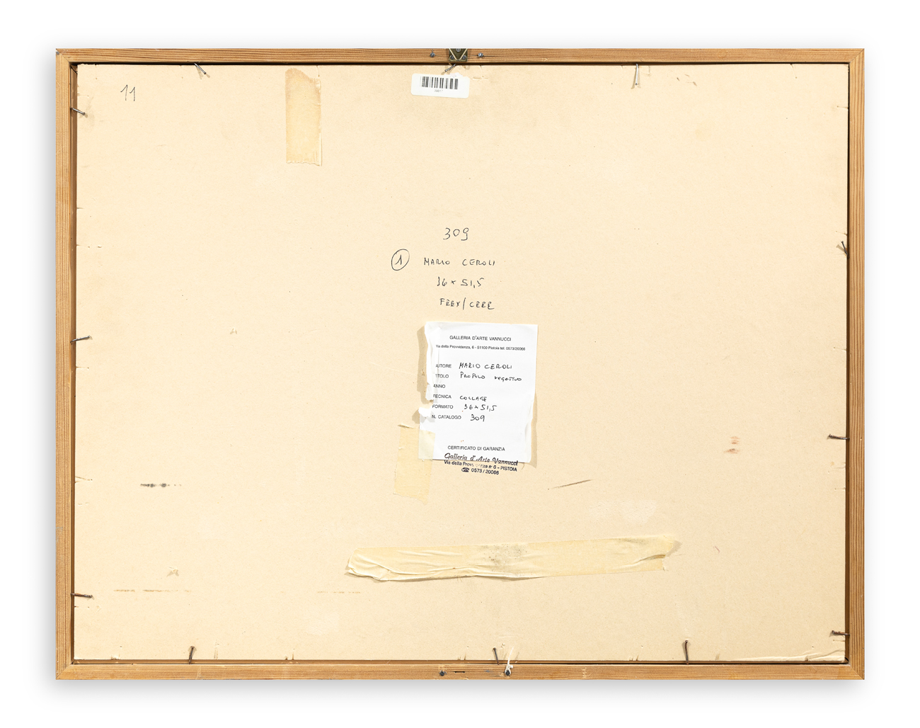Etichetta e Timbri della Galleria d'Arte Vannucci (PT) al retro del cartone protettivo