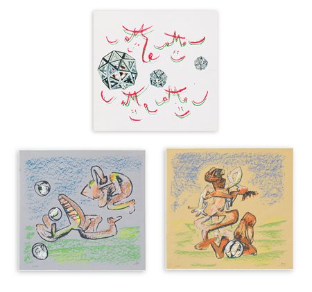 Splendida cartella contenente due serigrafie recanti firma e numerazione (Esemplari XI/XXV) a matita al fronte e una litografia a leporello con copertina e controcopertina in cartone telato rigido recante numerazione (Esemplare XI/XXV) a matita all'interno e firma a matita sull'ultimo elemento