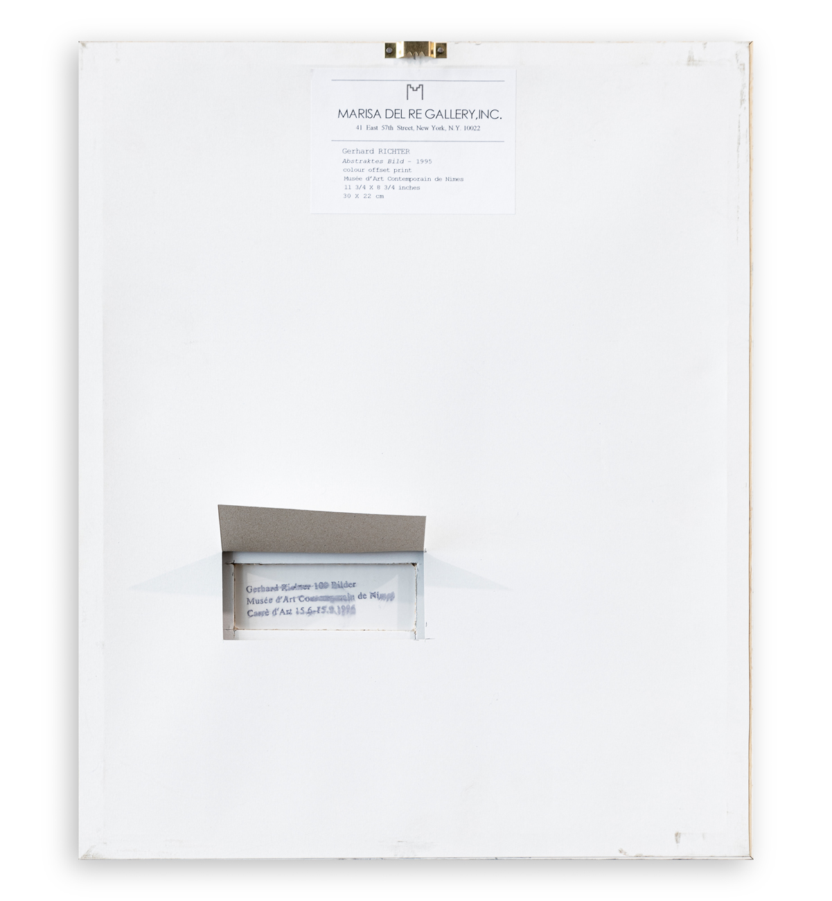 Etichetta della Marisa del Re Gallery, Inc (New York), con caratteristiche tecniche dell'opera, al retro del cartoncino protettivo