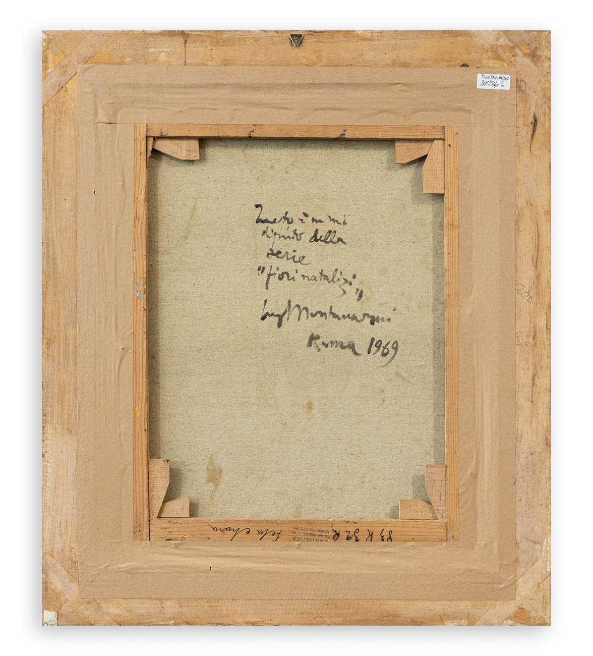 Firma, datazione e iscrizione 'Questo è un mio dipinto della serie Fiori Natalizi' al retro