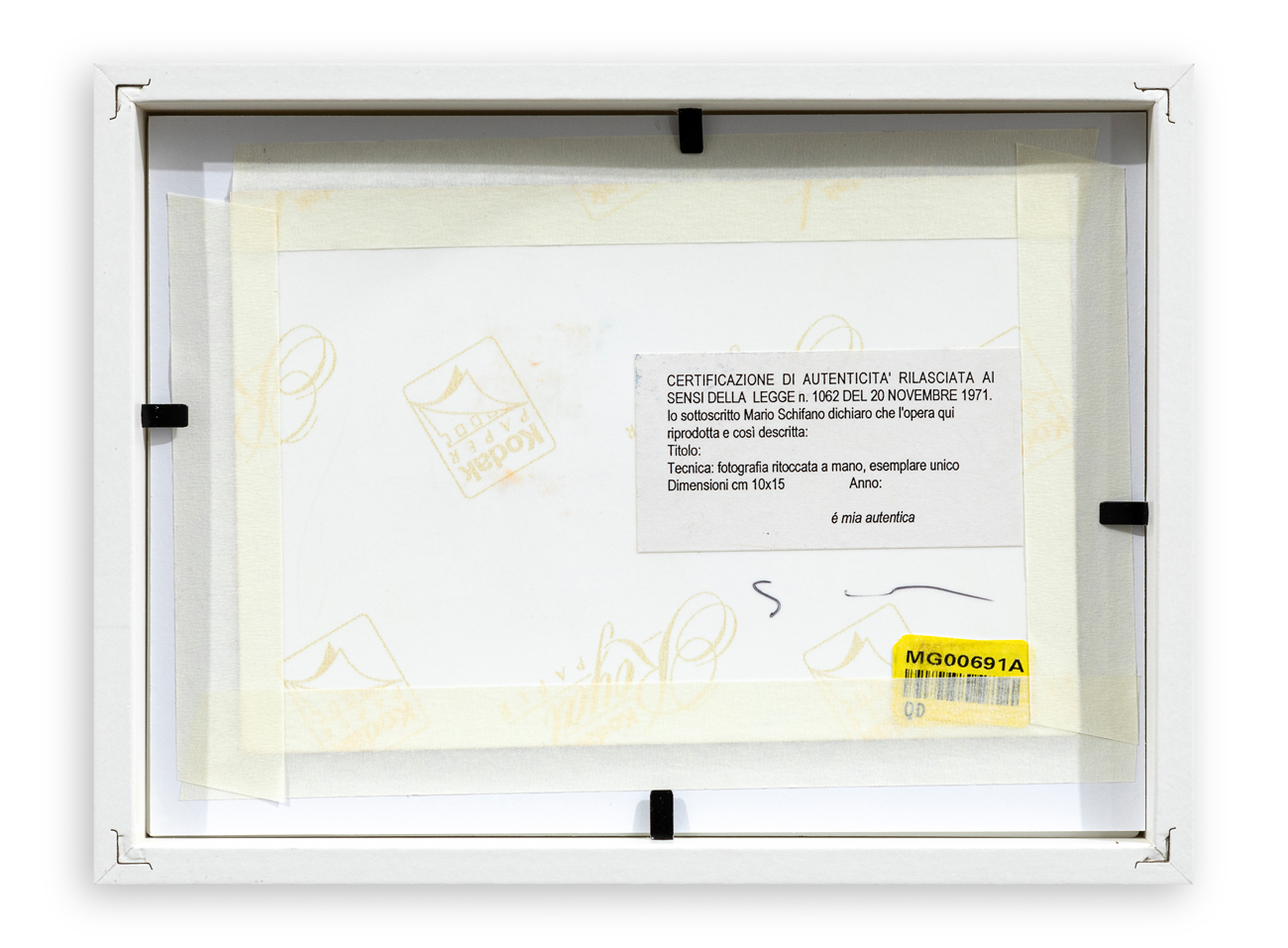 Certificato di autenticità a cura dell'Archivio Generale dell'Opera Pittorica di Mario Schifano - Fondazione Mario Schifano (RM) rilasciato in data 24/09/2007