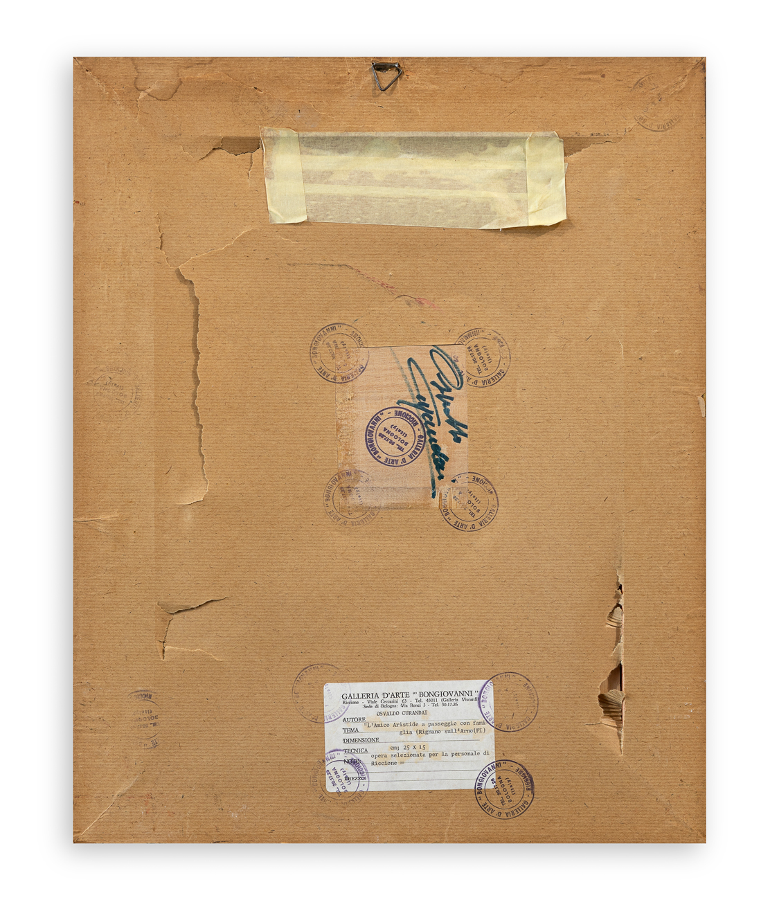 Etichetta della Galleria Bongiovanni (Riccione) al retro del cartone protettivo