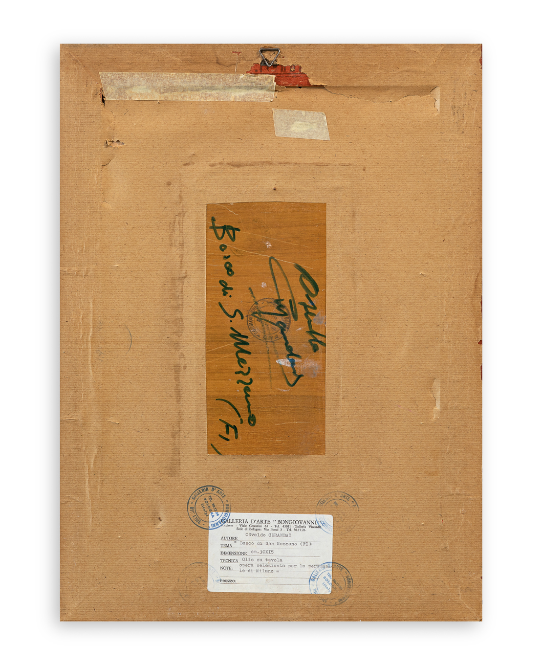 Etichetta della Galleria Bongiovanni (Riccione) al retro del cartone protettivo