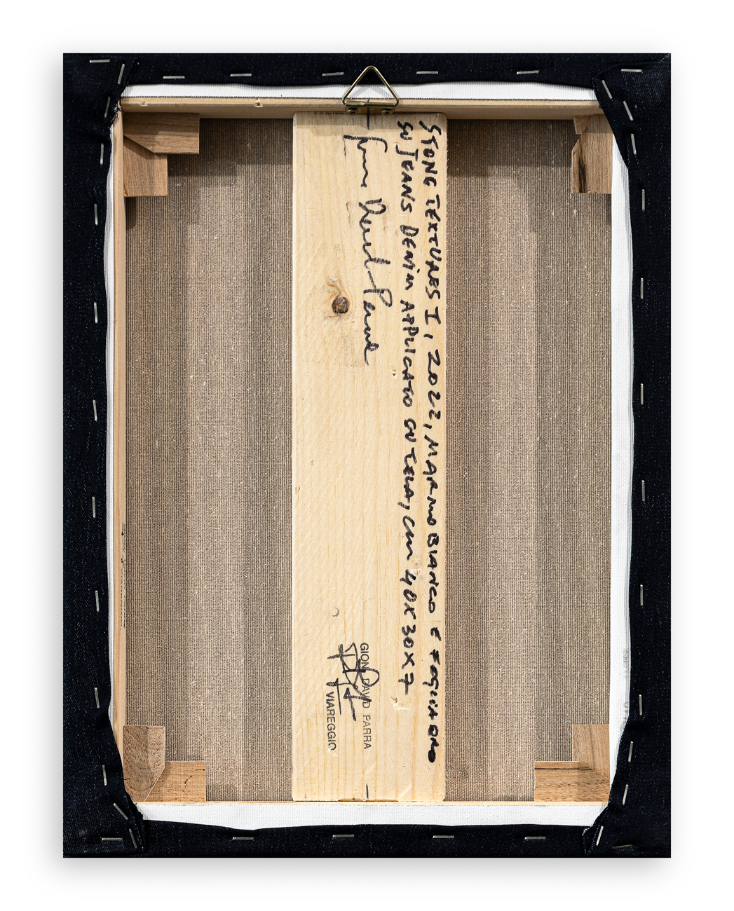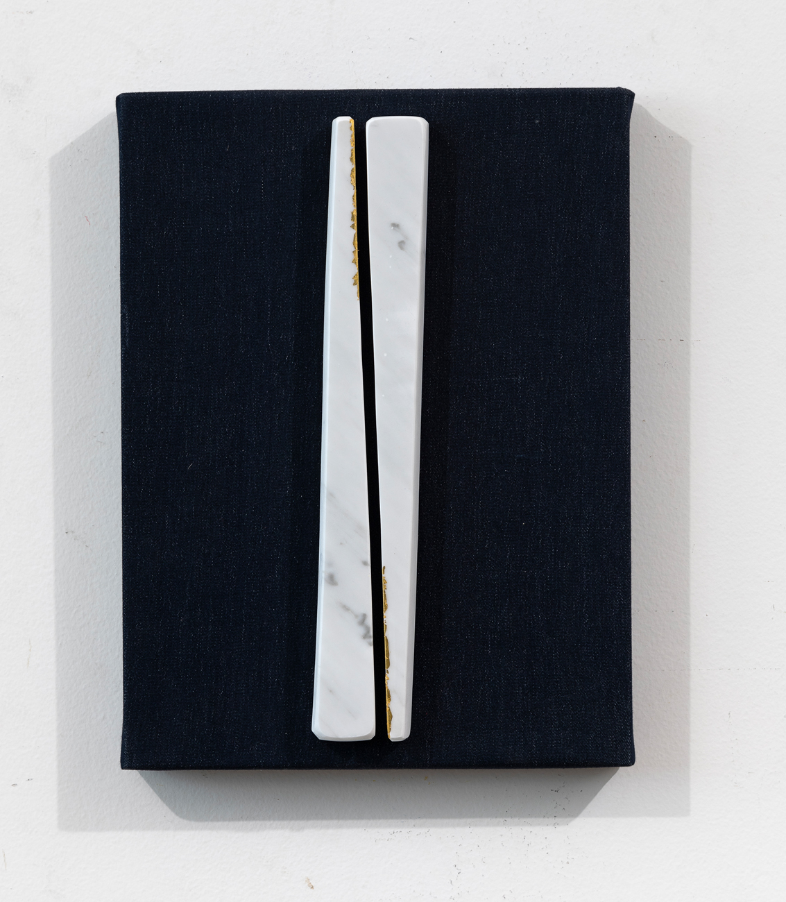 Marmo bianco e foglia oro su jeans denim applicato su tela