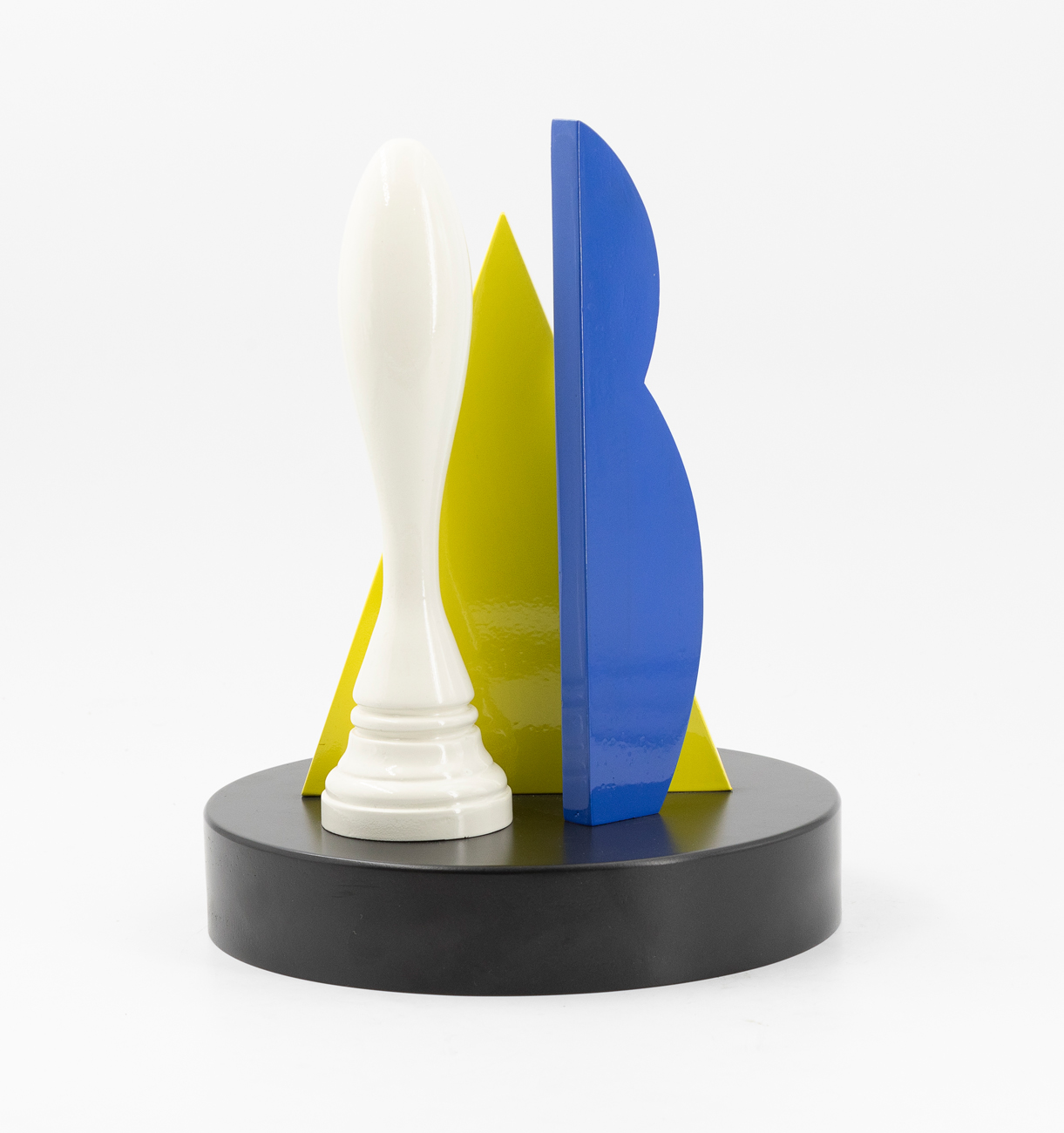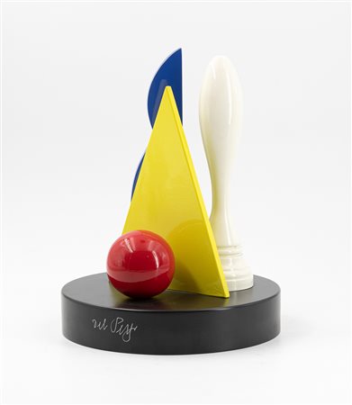Scultura realizzata con legni policromi sagomati poggianti su base circolare in legno