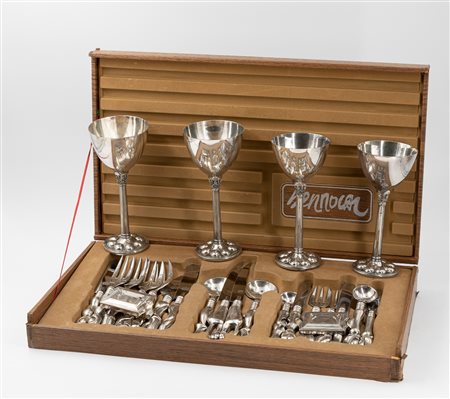 Lotto unico di 2 cofanetti: uno contenente un servizio di posate per due persone composto da 18 pezzi + 2 portacenere; l'altro contenente 2 calici da acqua e 2 calici da vino
