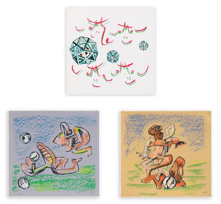 Splendida cartella contenente due serigrafie recanti firma e numerazione (Esemplari V/XXV) a matita al fronte e una litografia a leporello con copertina e controcopertina in cartone telato rigido recante numerazione (Esemplare V/XXV) a matita all'interno e firma a matita sull'ultimo elemento