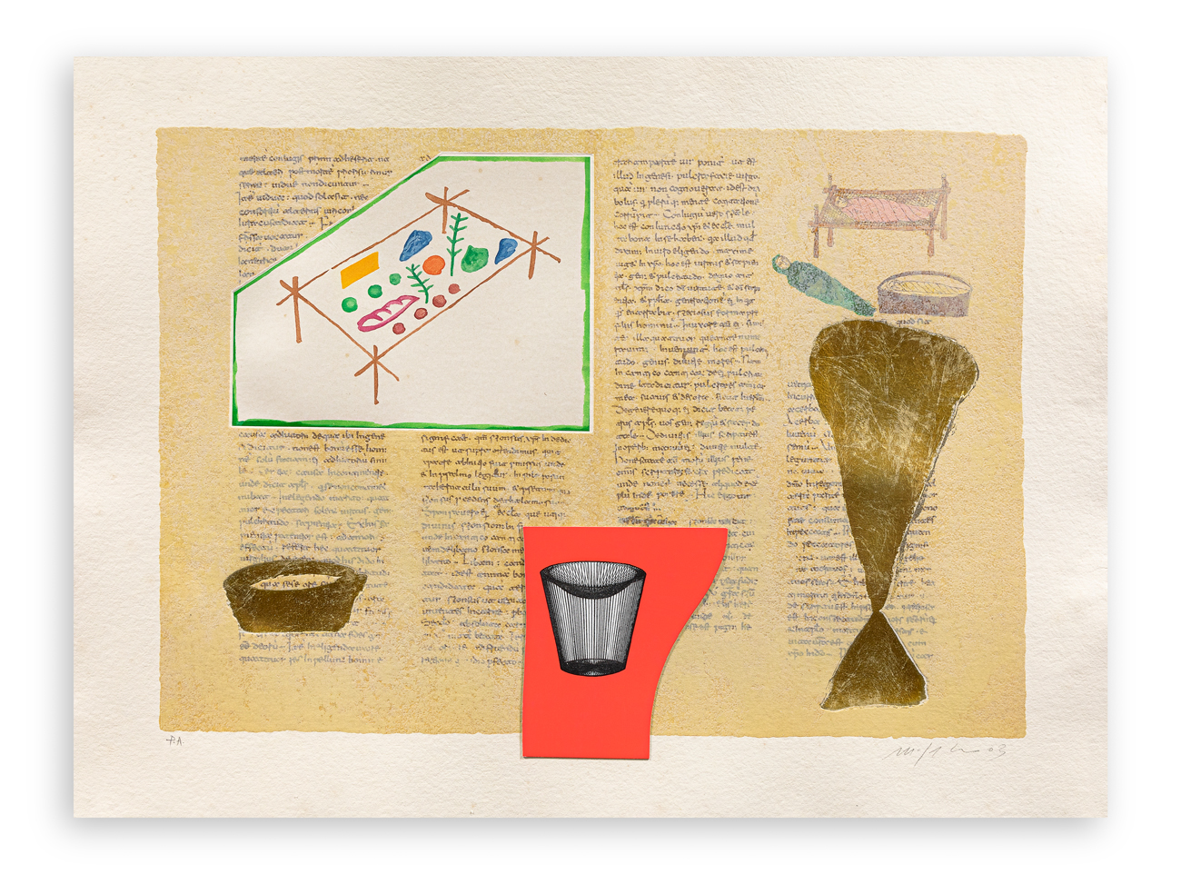 Serigrafia materica, polvere di quarzo, acquaforte e acquatinta su collage, floccaggio, con applicazioni di foglia oro su cartoncino, carta Sicars 800gr (foglio) e carta Japon (collage)