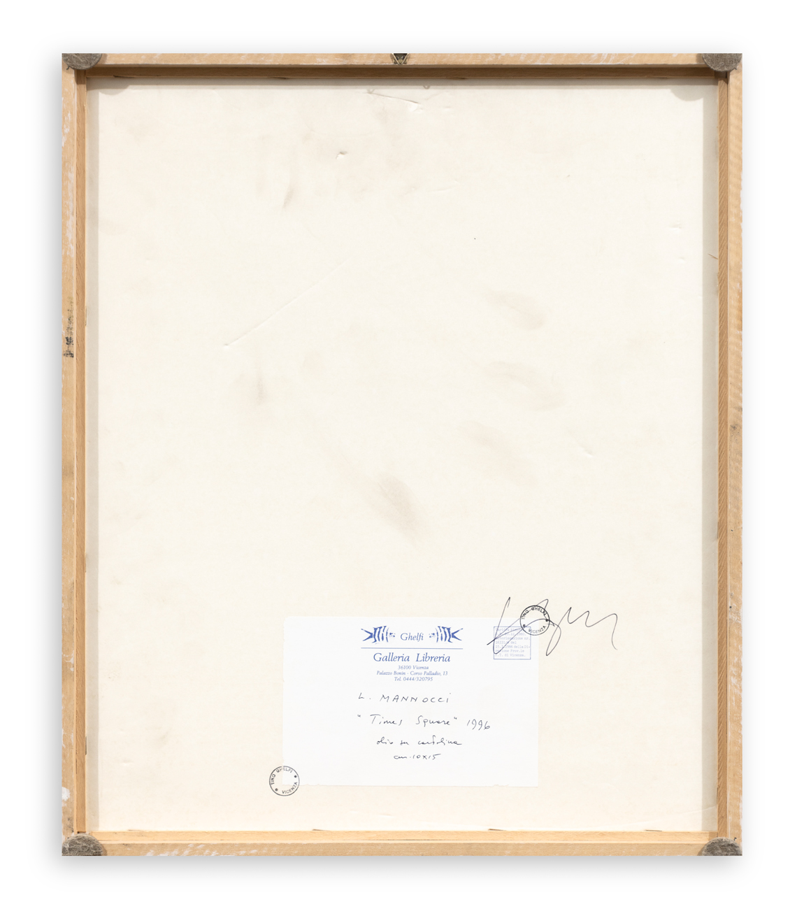 Timbri ed etichetta della Galleria Libreria Ghelfi (VI), con caratteristiche tecniche dell'opera, al retro del cartone protettivo
