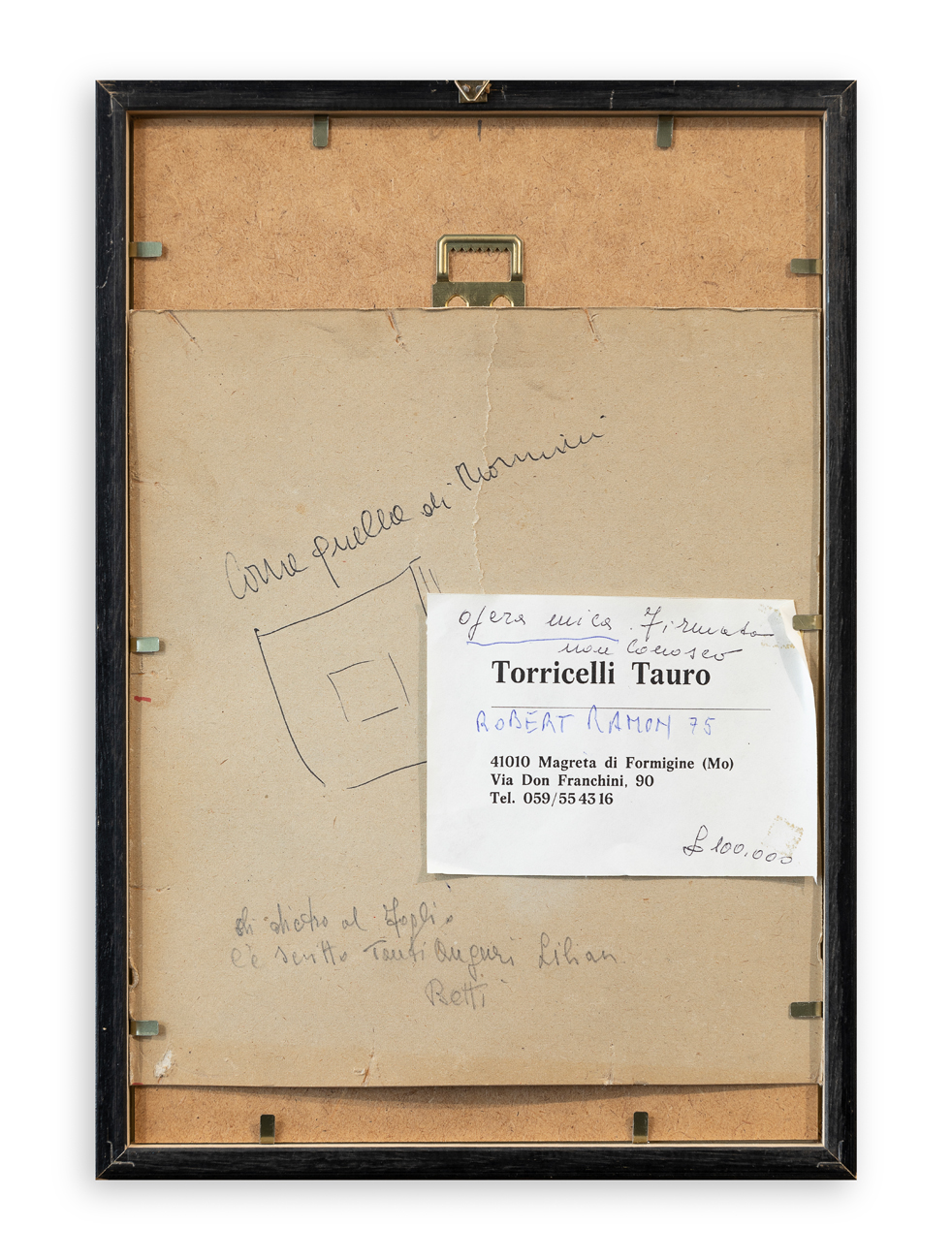 Etichetta della Collezione Tauro Torricelli (MO) al retro della tavola protettiva