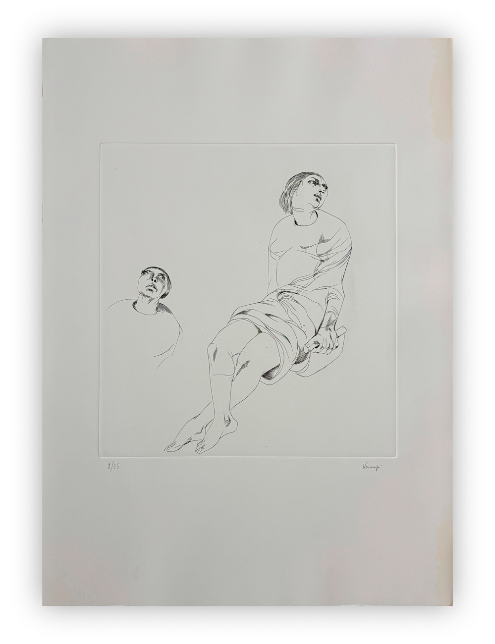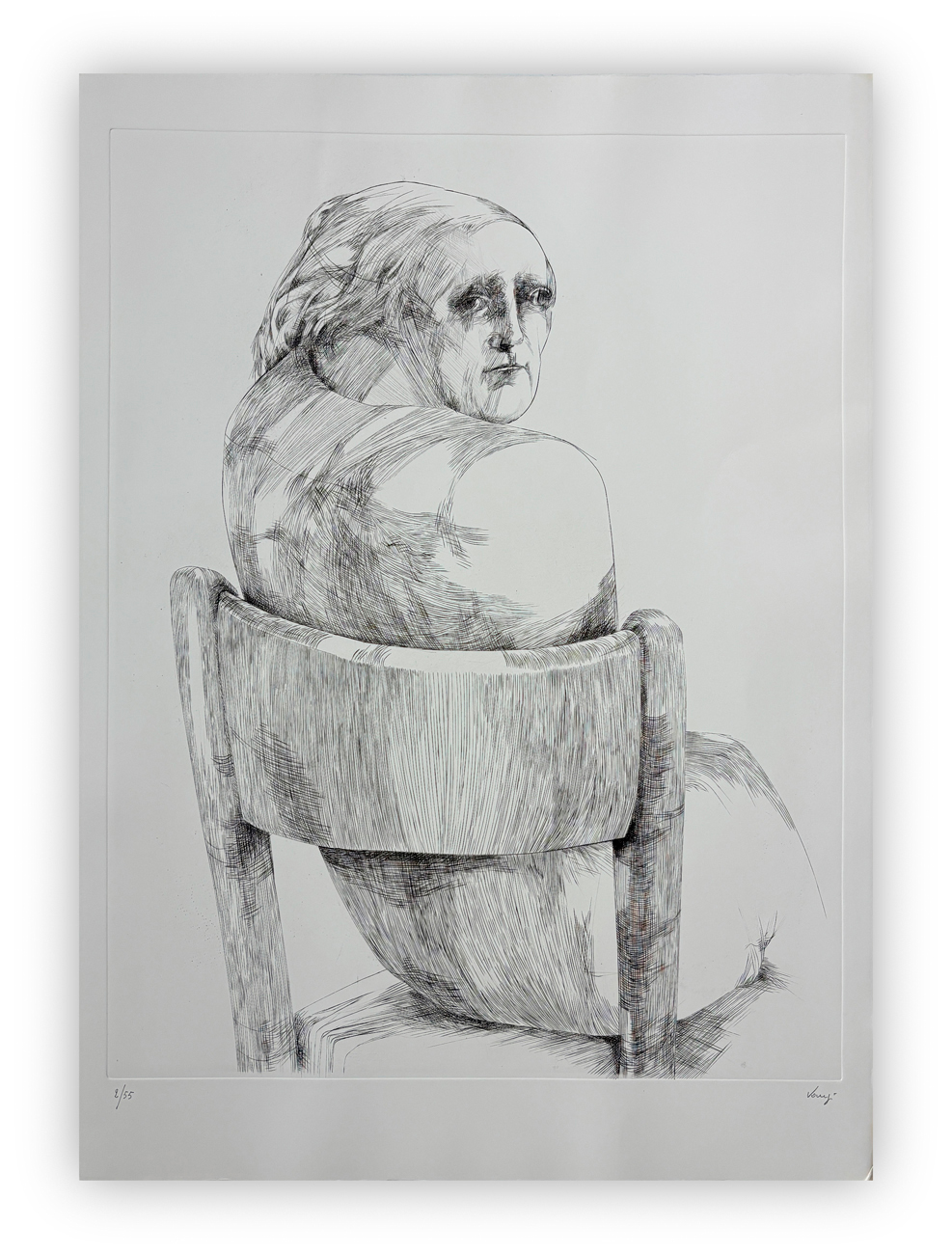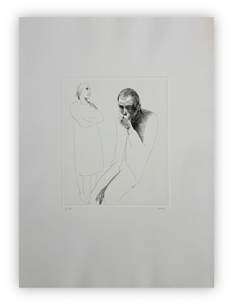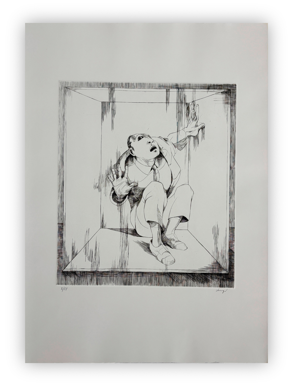 Cartella contenente testo di presentazione di Pier Carlo Santini e sei incisioni a bulino di Giuliano Vangi, ciascuna recante firma e numerazione (Esemplari 2/55) a matita al fronte