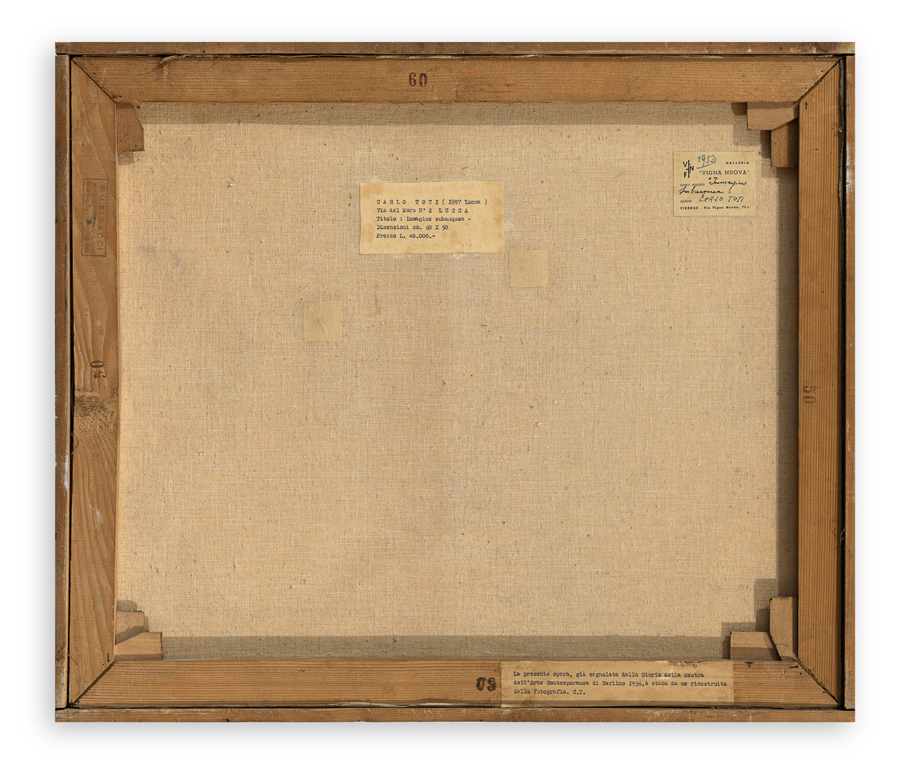 Etichetta della Galleria Vigna Nuova (FI), con caratteristiche tecniche dell'opera, al retro