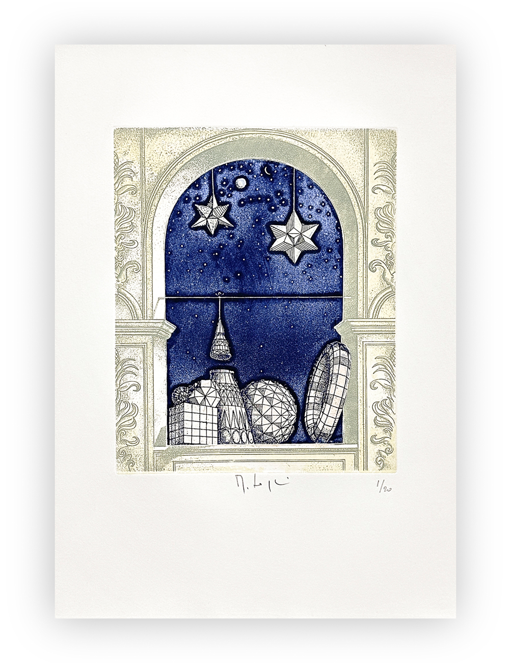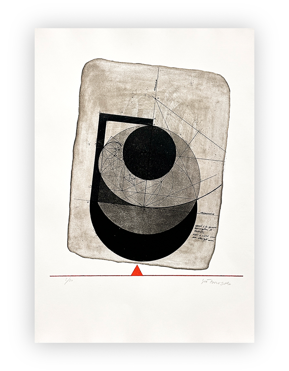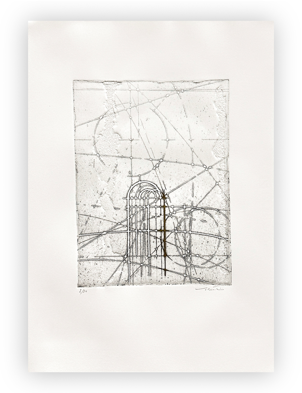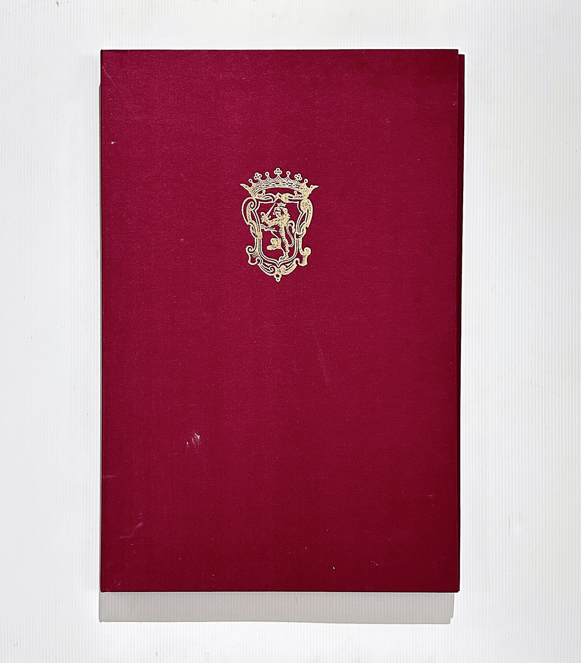 Cartella contenente presentazione di Franco Foschi e 5 acqueforti di Mario Logli, Giò Pomodoro, Piergiorgio Spallacci, Valeriano Trubbiani e Walter Valentini, ciascuna recante firma e numerazione (Esemplari 1/20) a matita al fronte
