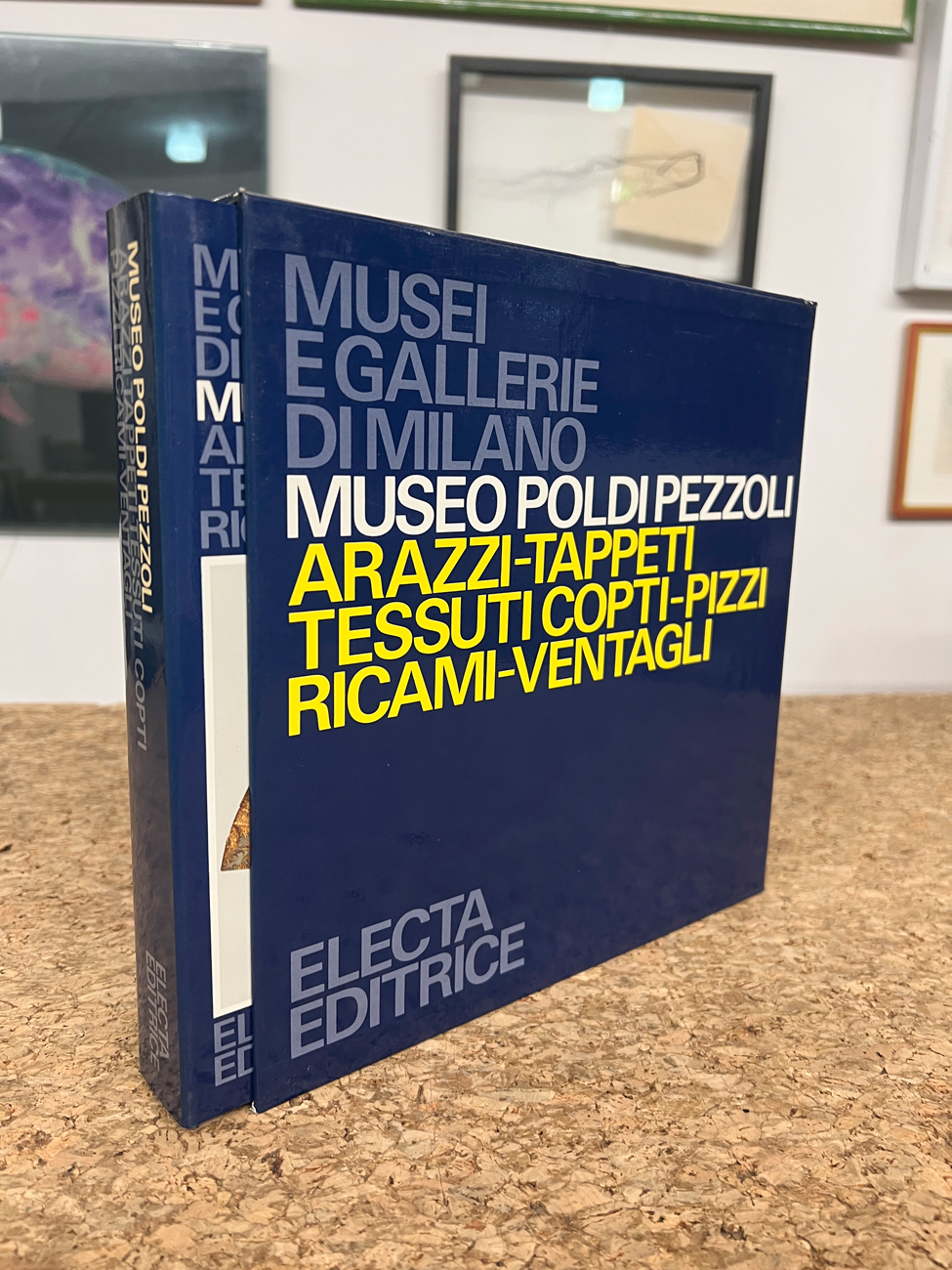 Cofanetto contenente un catalogo riccamente illustrato relativo alla collezione di arazzi, tappeti, tessuti copti, pizzi, ricami e ventagli del Museo Poldi Pezzoli di Milano