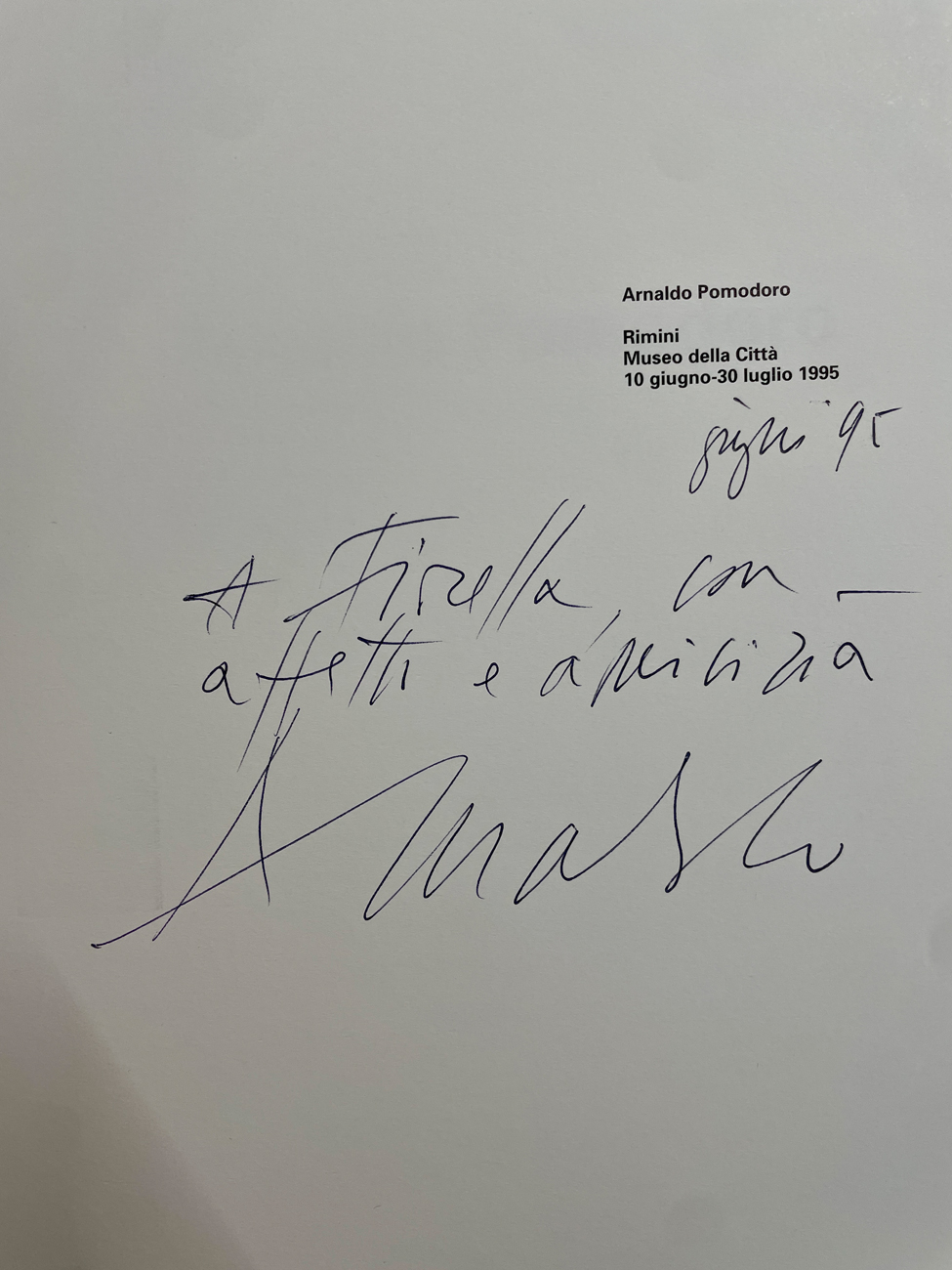 Il catalogo dell'esposizione di Rimini reca firma e dedica ad personam datata Giugno 1985 a biro all'interno