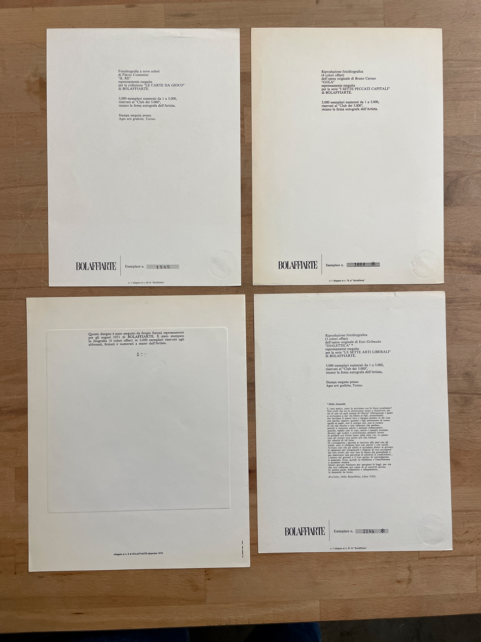 EDIZIONI BOLAFFIARTE (GRIBAUDO, COSTANTINI, CARUSO E SARONI) - Lotto unico di 4 fotolitografie: