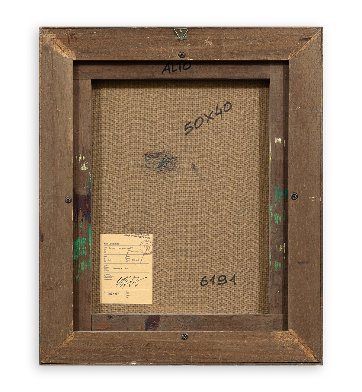 Timbro ed etichetta dell'Artista, recante firma, titolo, tecnica, misure, datazione e numero di repertorio, al retro