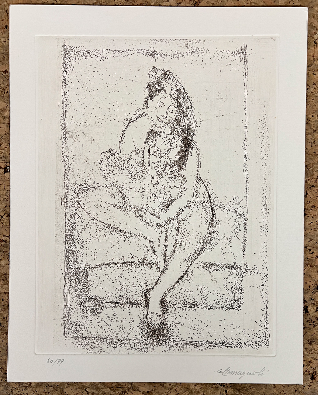Il presente esemplare è arricchito dalla presenza dell'ultima acquaforte realizzata dall'Artista, intitolata 'Nudo con fiori' e recante firma e numerazione (Esemplare 50/99) a matita al fronte di Tina Romagnoli (in seguito alla sopraggiunta mancanza del Maestro)