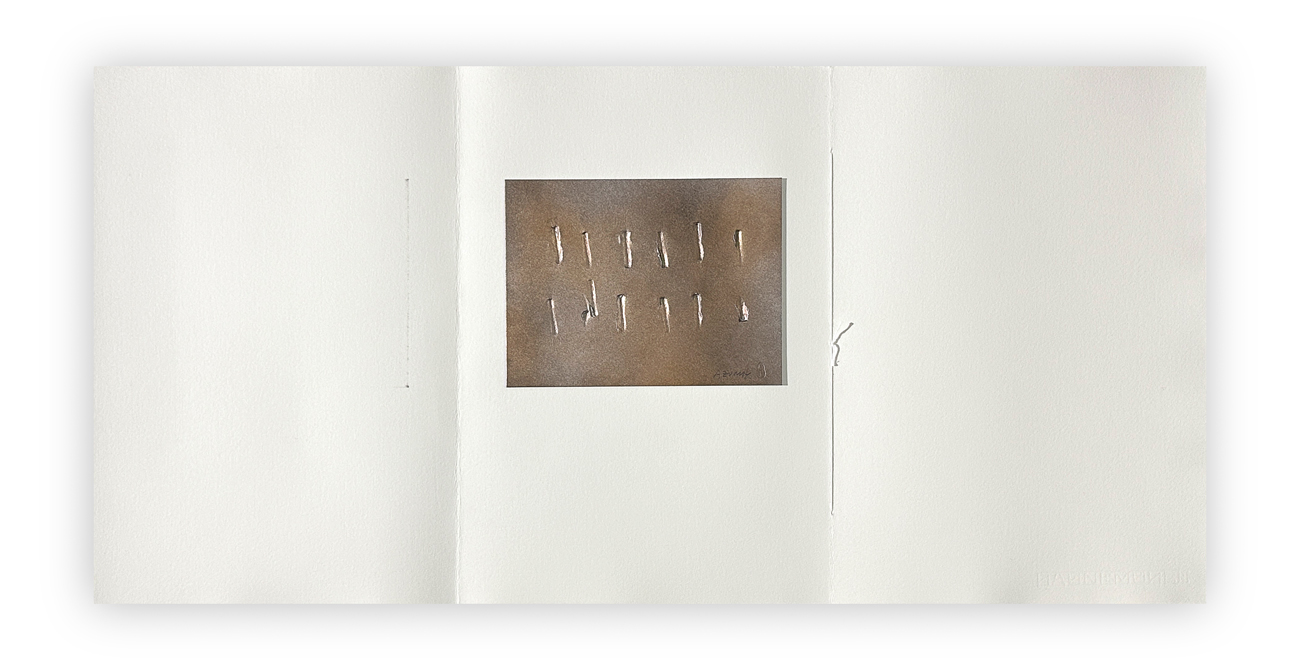 - pagina tipografica recante ideogramma 'MU' stampato tipograficamente, con sigillo personale dell'artista