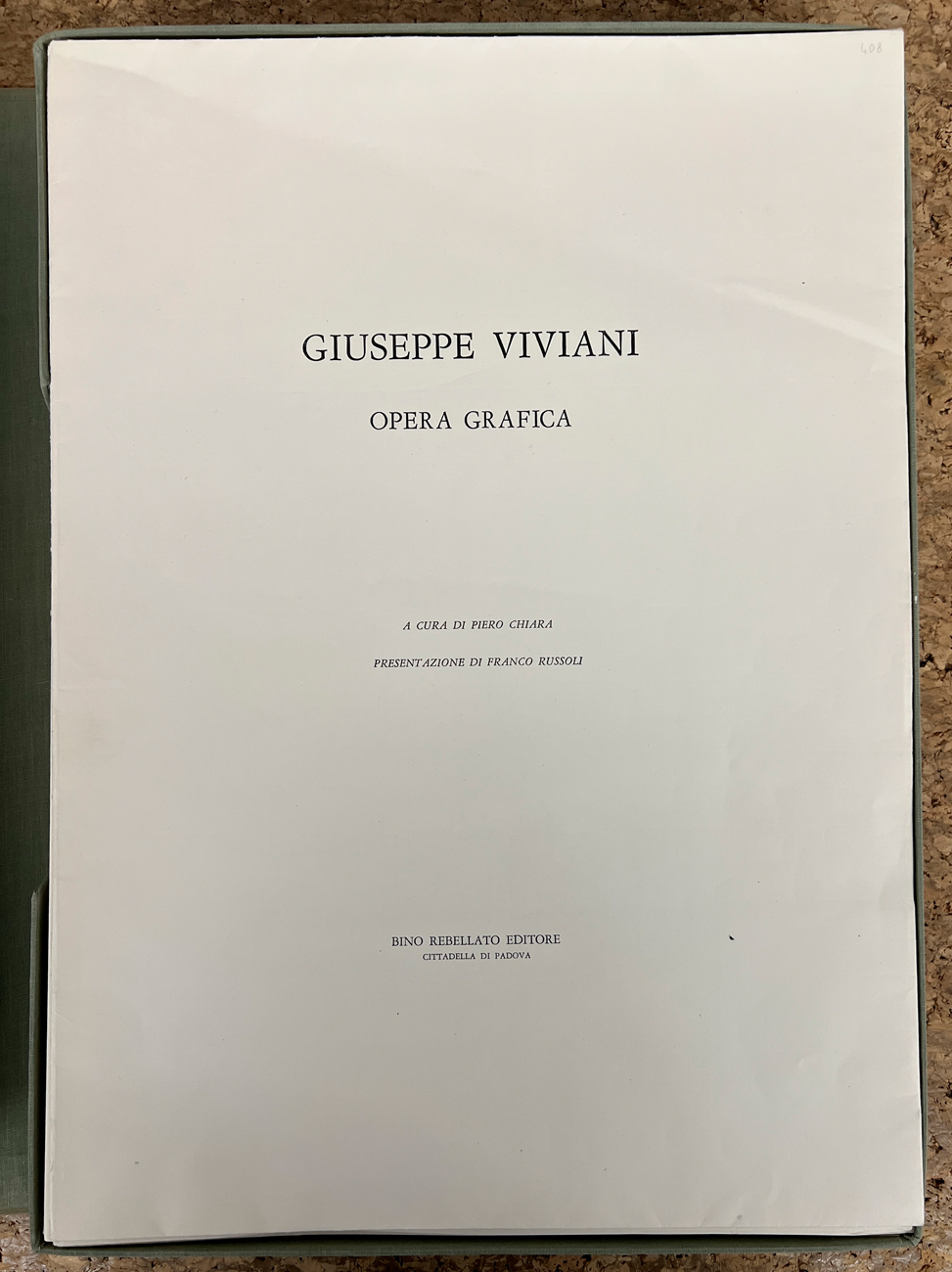 Cofanetto recante fascicolo introduttivo a cura di Piero Chiara con presentazione di Franco Russoli e 98 riproduzioni in fototipia di opere grafiche di Giuseppe Viviani, ciascuna delle quali entro pieghevole di presentazione