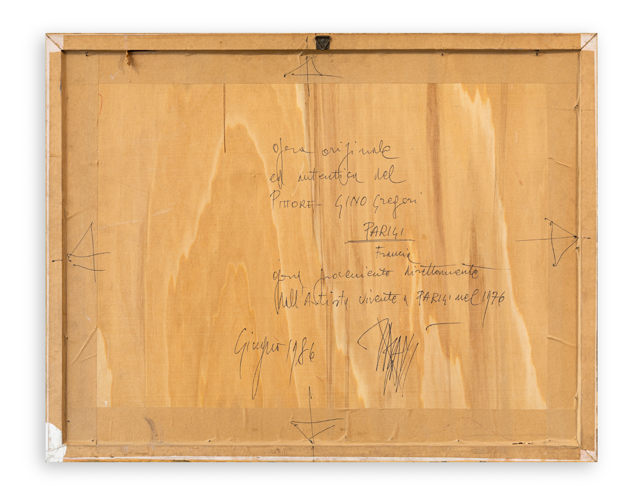Firma e dichiarazione di autenticità e provenienza del gallerista Pagani al retro della tavola protettiva