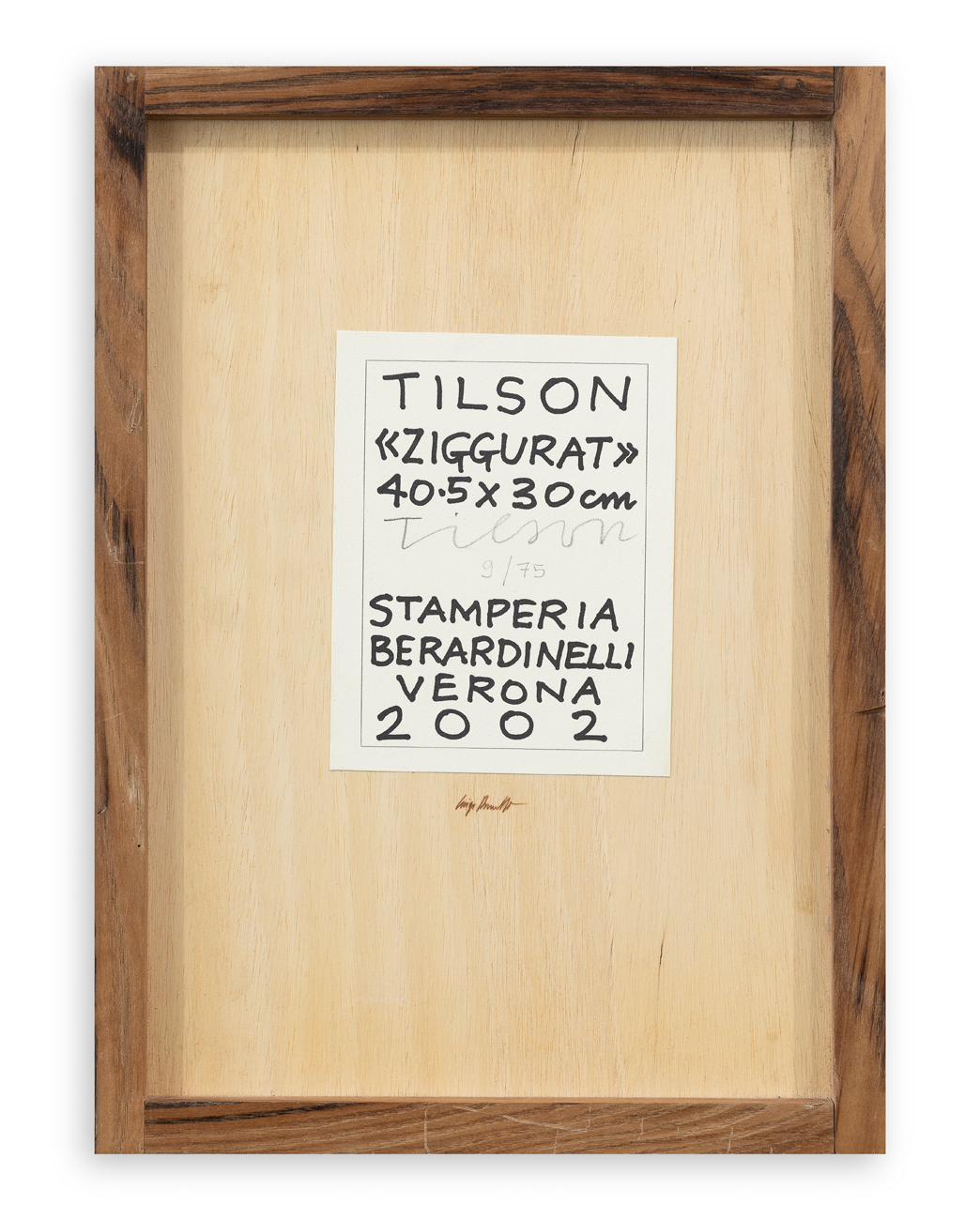 Cartiglio dell'edizione recante caratteristiche tecniche e firma dell'Artista e numerazione (Esemplare 9/75) a matita al retro