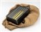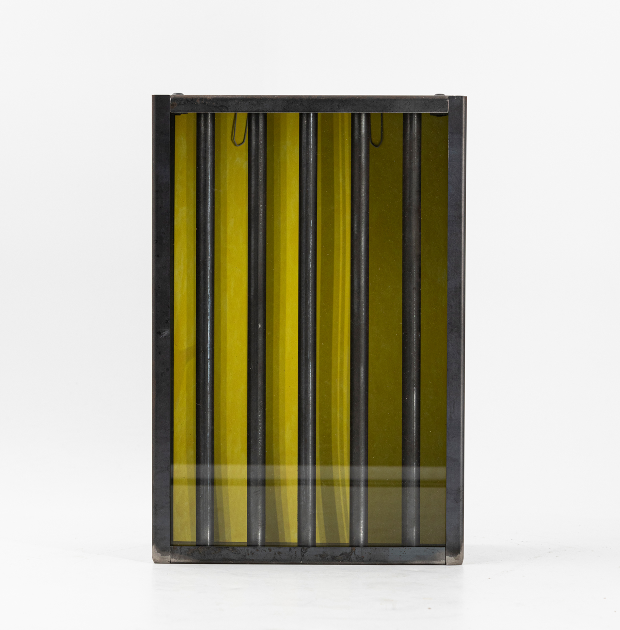 Scultura multipla in ferro, carta dipinta a mano con smalto giallo, fermagli