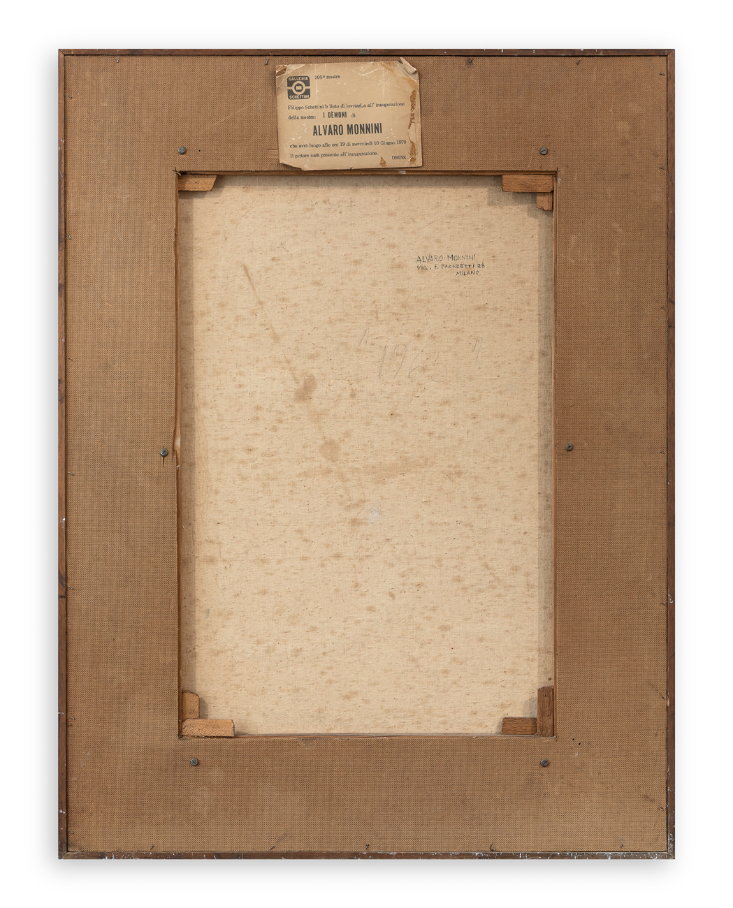 Cartiglio dell'esposizione 'Alvaro Monnini - I Demoni - Galleria Schettini, Milano - 10 Giugno 1970' al retro