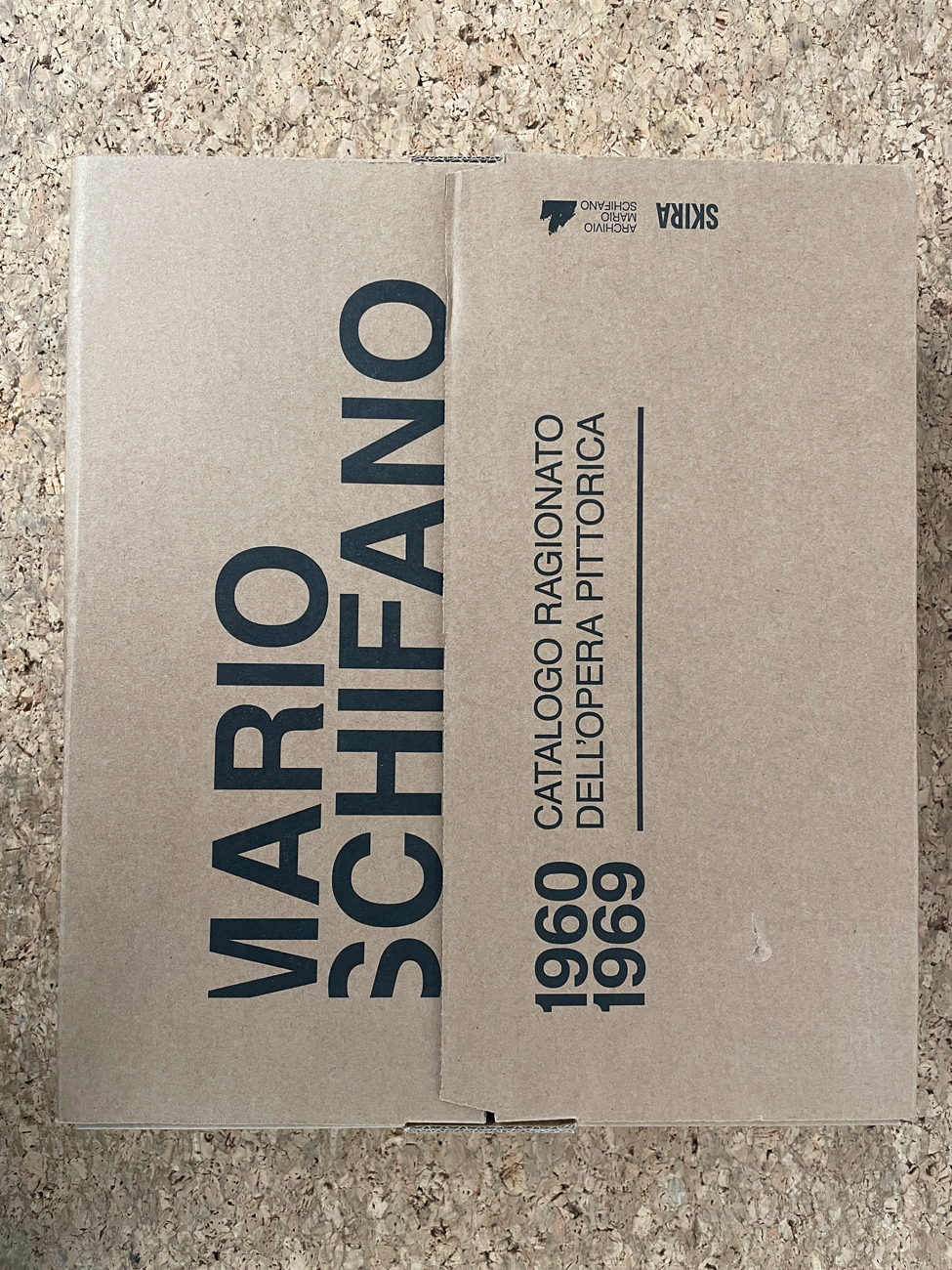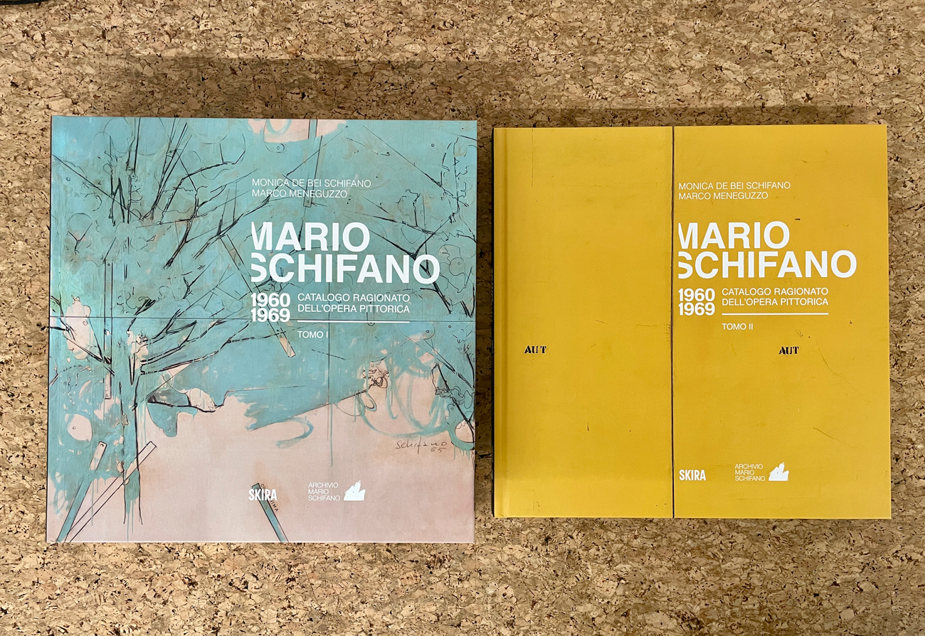Cofanetto contenente due cataloghi riccamente illustrati (Tomo I e Tomo II) dell'opera pittorica di Mario Schifano, a cura di Monica De Bei Schifano e Marco Meneguzzo