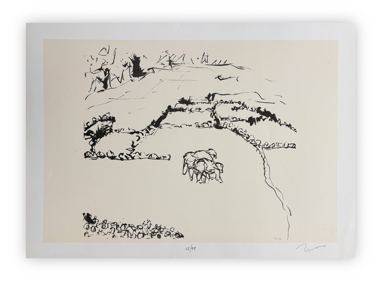 Cartella contenente testo di presentazione dell'Artista ed una litografia recante firma e numerazione (Esemplare 68/75) a matita al fronte