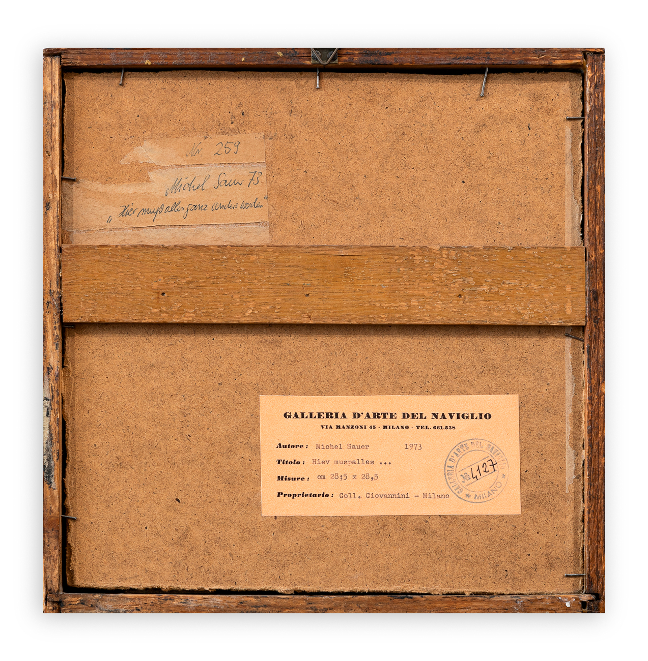 Etichetta e timbro della Galleria d'Arte del Naviglio (MI) con caratteristiche tecniche dell'opera al retro
