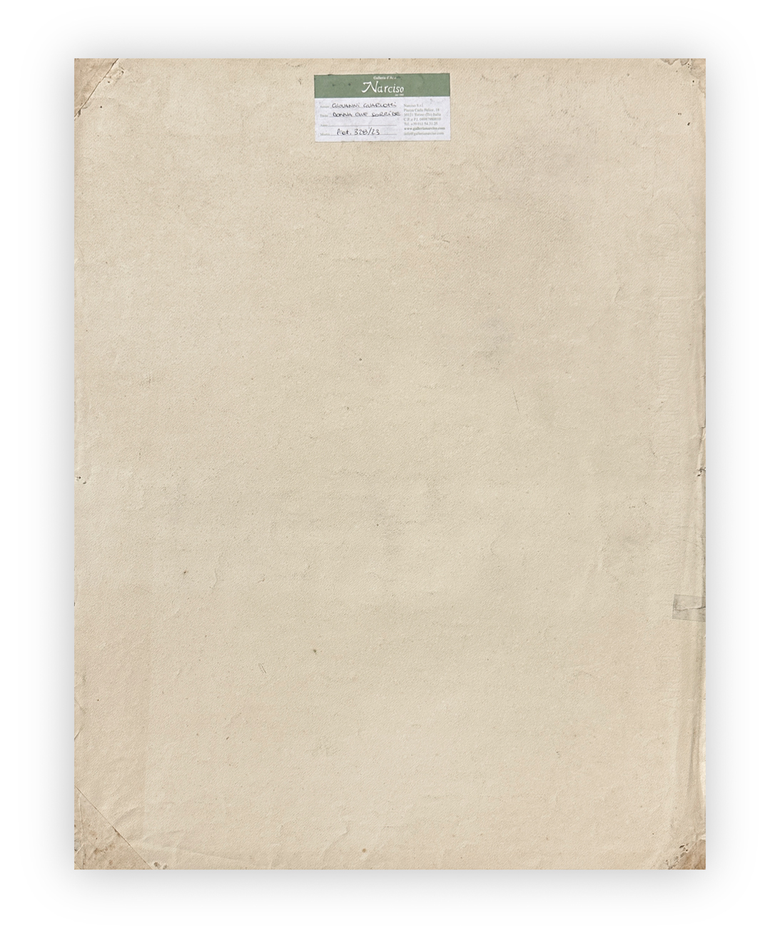 Etichetta della Galleria d'Arte Narciso (TO), con caratteristiche tecniche dell'opera e numero di repertorio, al retro