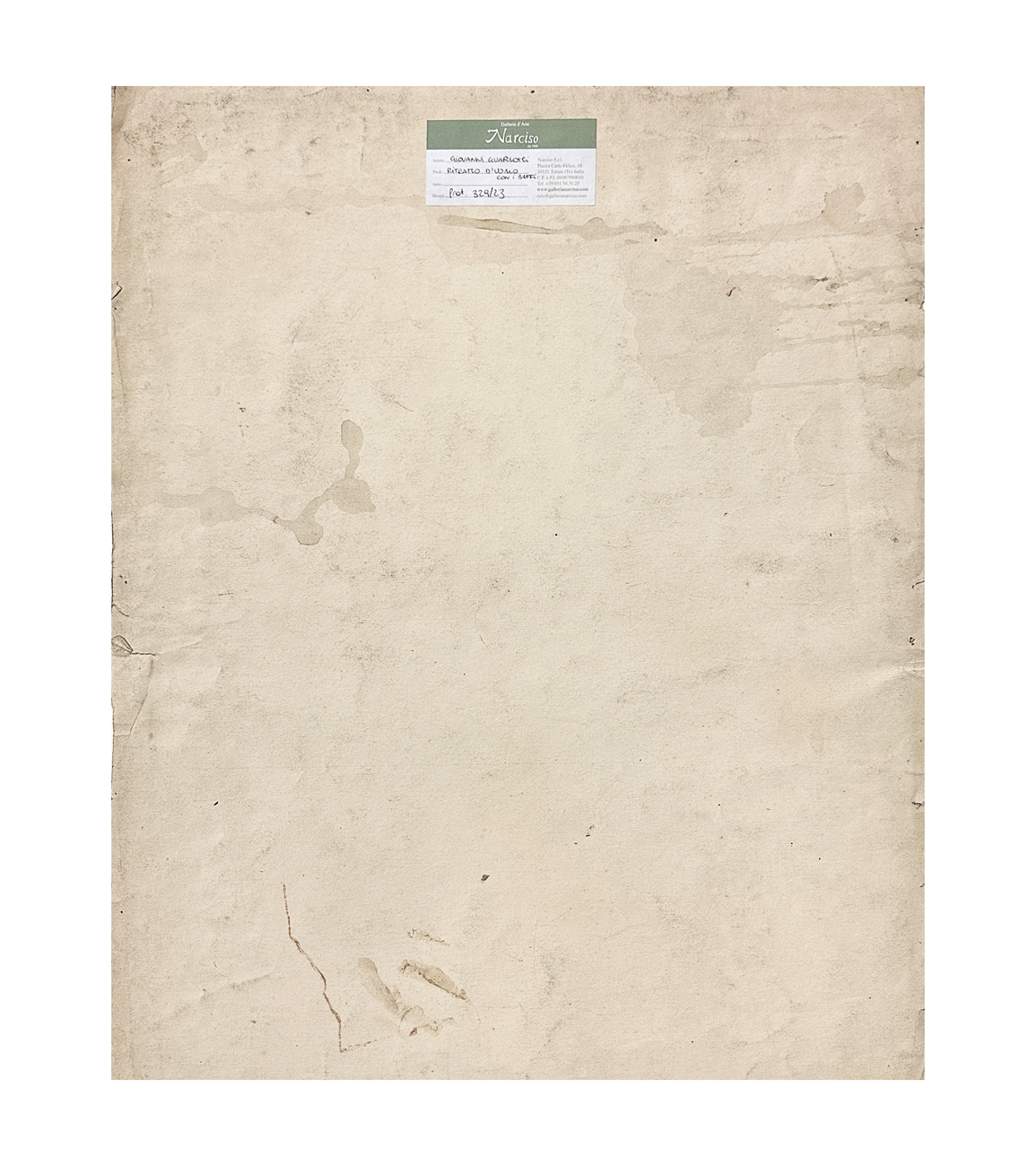 Etichetta della Galleria d'Arte Narciso (TO), con caratteristiche tecniche dell'opera e numero di repertorio, al retro