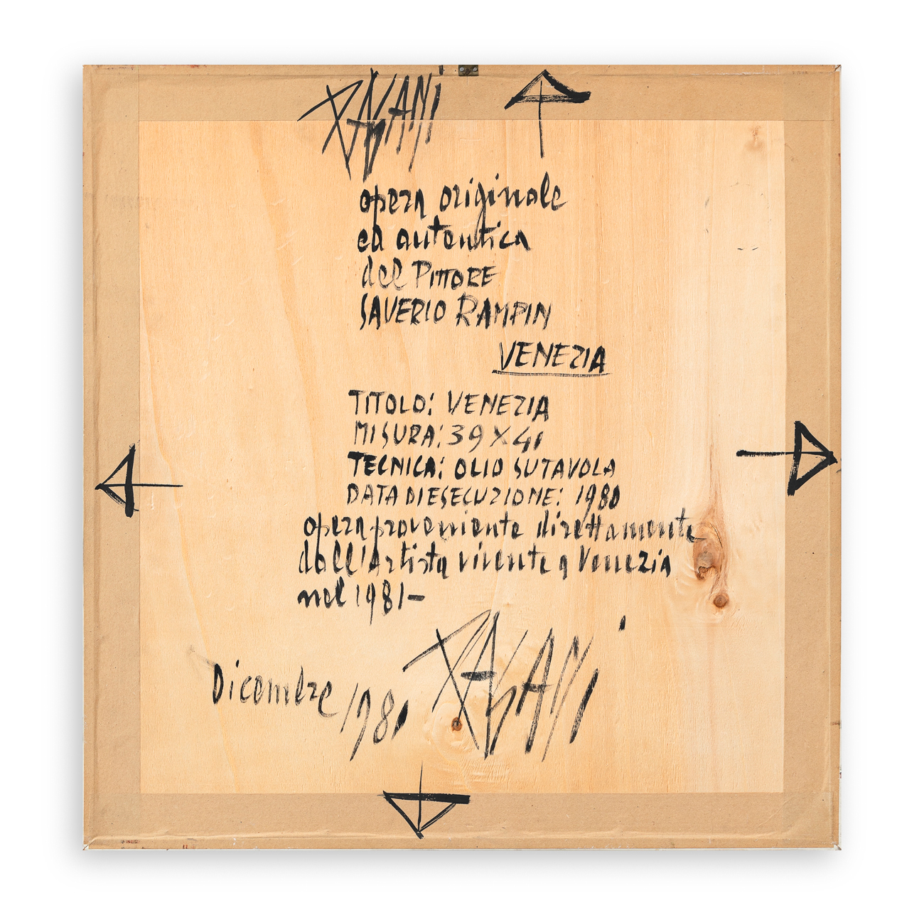 Firma e dichiarazione di autenticità e provenienza del gallerista Pagani al retro della tavola protettiva