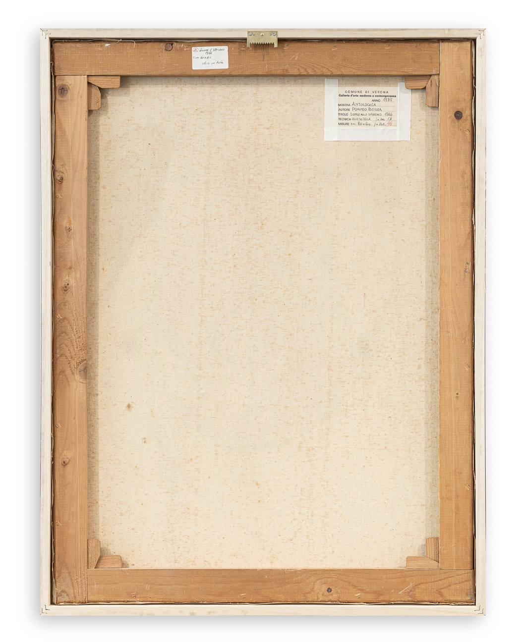 Etichetta dell'esposizione tenutasi presso 'Galleria d'Arte Moderna e Contemporanea - Comune di Verona', con caratteristiche tecniche dell'opera, al retro