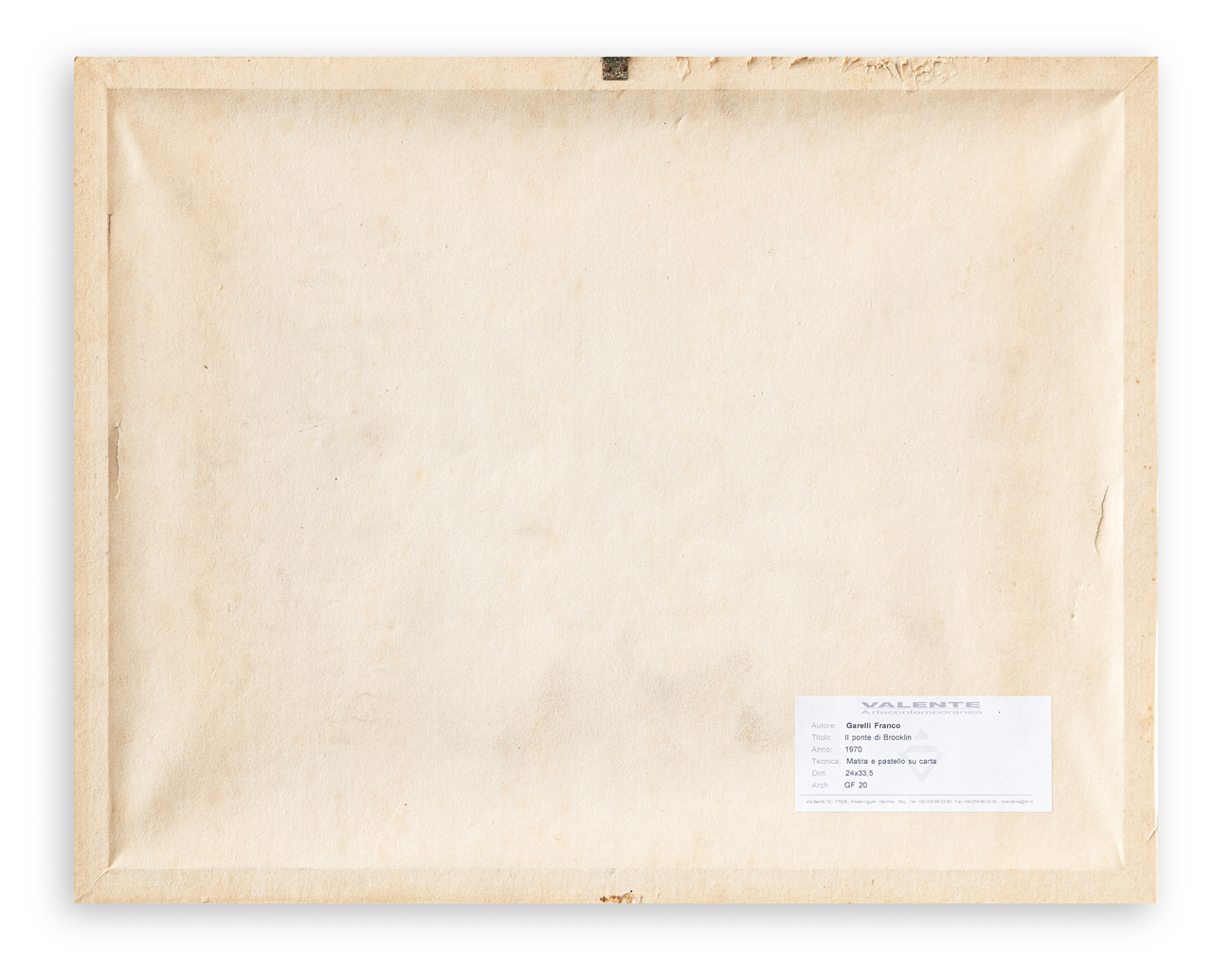 Etichetta della Galleria Valente Arte Contemporanea (SV) al retro del cartone protettivo