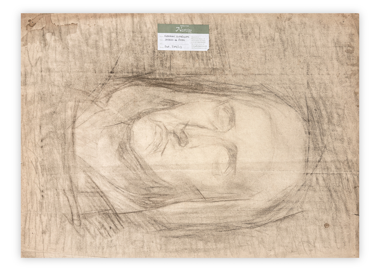Etichetta della Galleria d'Arte Narciso (TO), con caratteristiche tecniche dell'opera e numero di repertorio, al retro