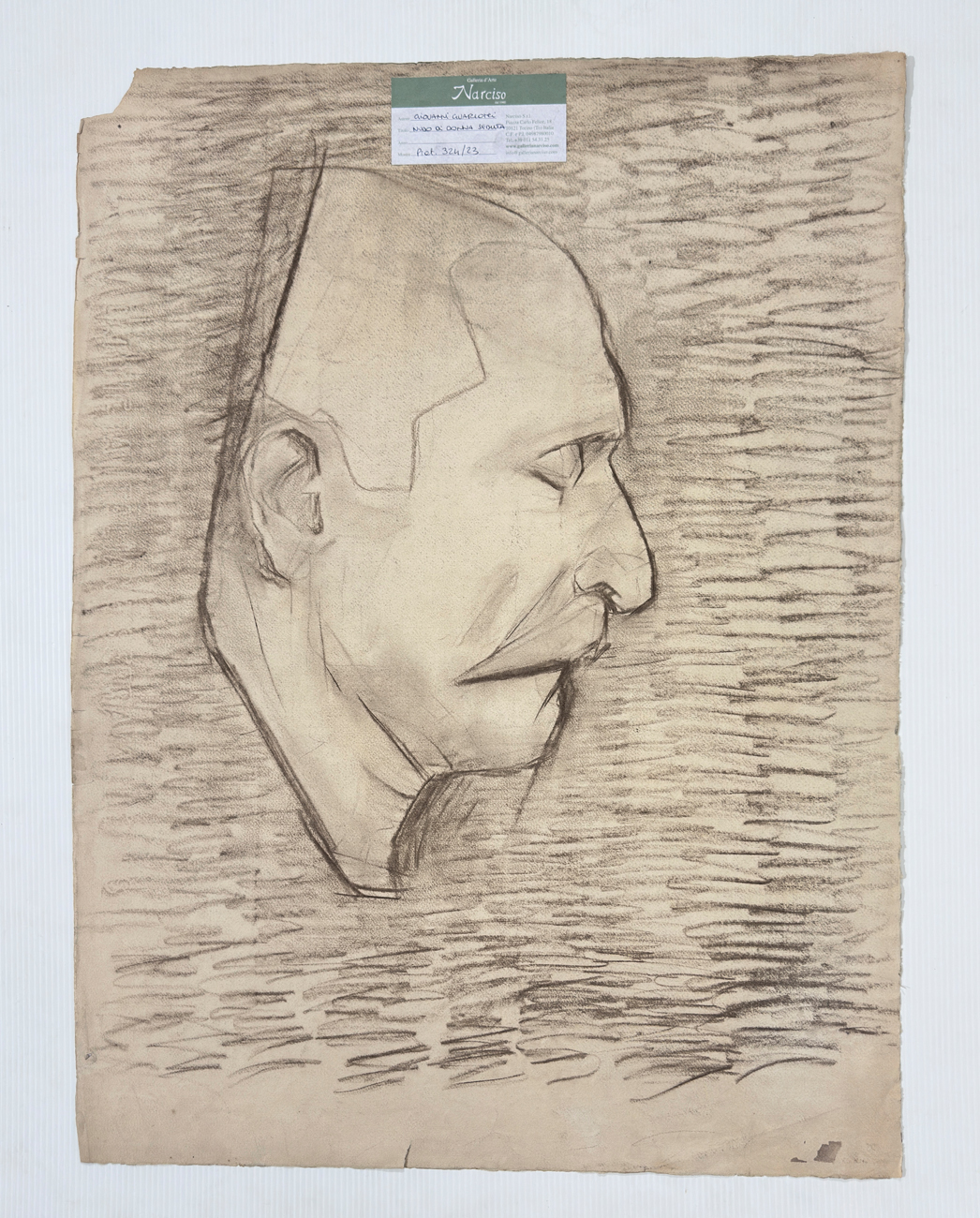 Etichetta della Galleria d'Arte Narciso (TO), con caratteristiche tecniche dell'opera e numero di repertorio, al retro