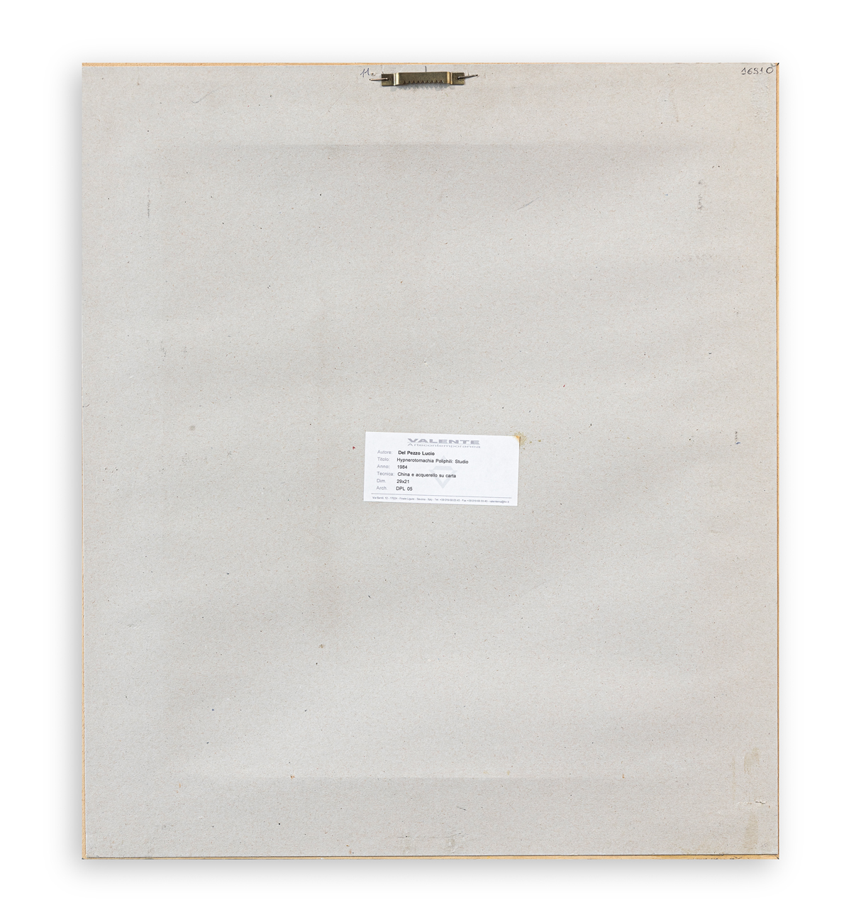 Etichetta della Galleria Valente Arte Contemporanea (SV) al retro del cartone protettivo
