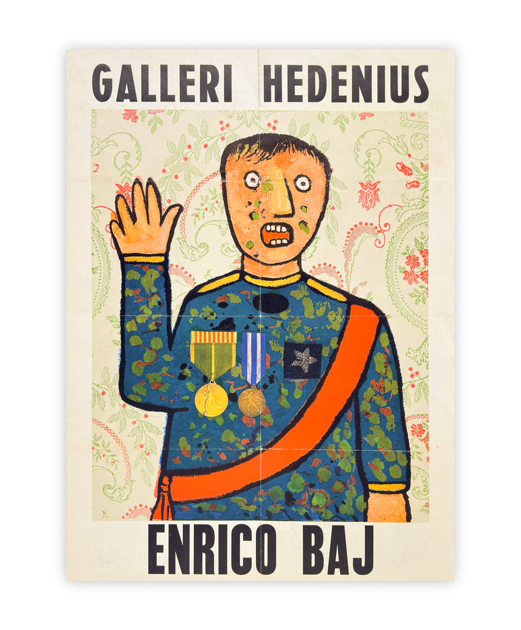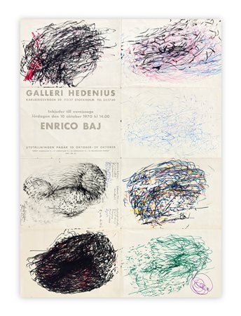 Manifesto della mostra Enrico Baj tenutasi alla Galleri Hedenius recante al retro 7 disegni realizzati con una macchina Métamatique di Jean Tinguely