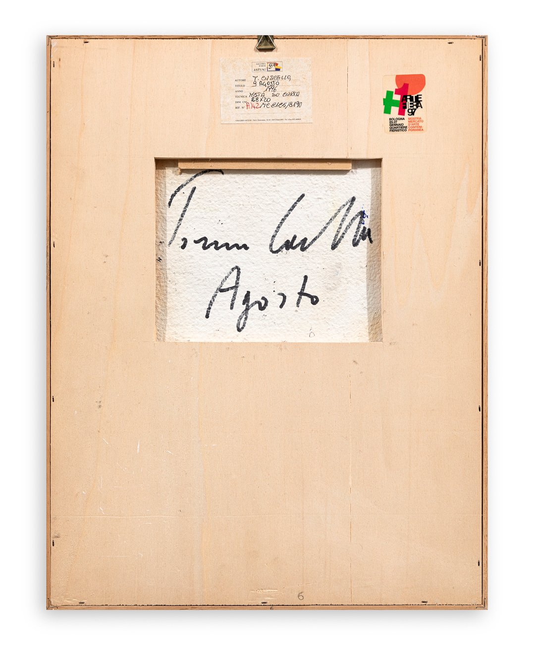 Etichetta della Galleria Astuni (PS), con caratteristiche tecniche dell'opera, al retro