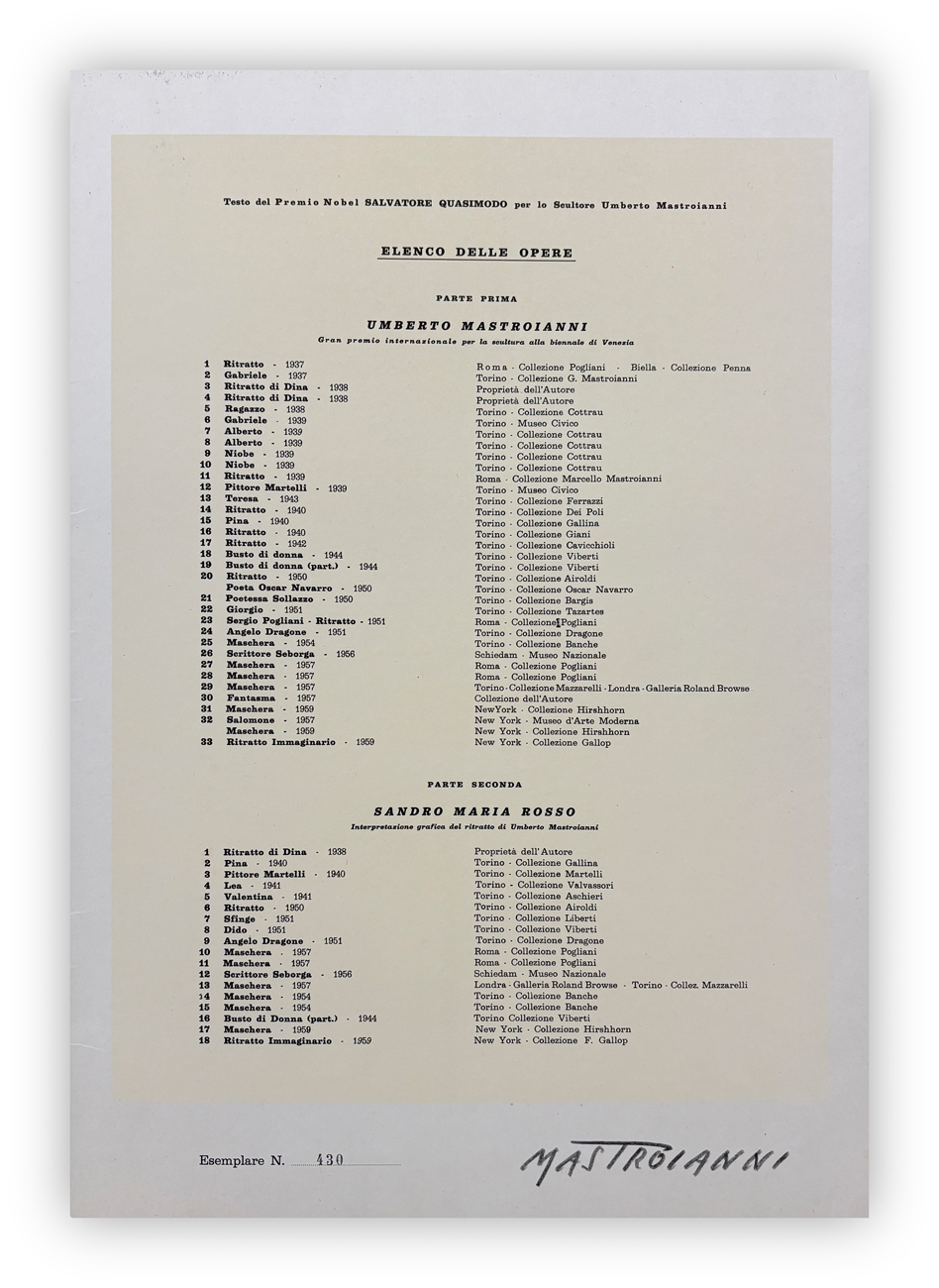Si allega il fascicolo illustrato 'Mastroianni. Il ritratto' recante testi di Salvatore Quasimodo (Sandro Maria Rosso editore Stampatore, 1964)